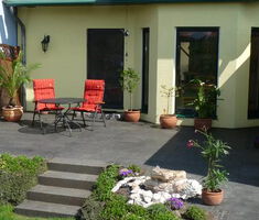 Ob nun die Sitzecke mit Basaltplatten im Schatten alter Obstbäume oder das große Holzdeck für sonnige Stunden im Sommer