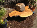 Die Platte ist in einen Sandsteinblock eingelassen, dessen Gewicht bei etwa 300 Kg liegt! Also nur mit Sackkarre und auf Rollen in den Garten zu bekommen. Das ist das Gegengewicht, wenn drei oder vier Personen auf dem „Stuhl“ sitzen.