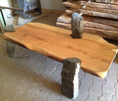 Ein ausgefallenes Einzelstück! In den Sandsteinblock ist die Tischplatte eingeschoben und durch das große Gewicht des Natursteines ist es sogar möglich, die Platte mit etwa 80 Kg zu belasten, ohne daß er kippt. Ich habe mich letztens hier in unserer Ausstellung kurz auf die Platte gesetzt – der Tisch blieb stehen. Also kein Problem für Kaffeetassen und Co.