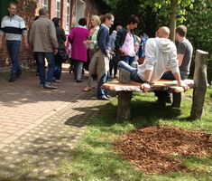 Die Tischplatte ist aus einer alten Esche gemacht. Der Baum stand hier in der Nachbarschaft und wurde aus Altersgründen gefällt. Nachdem das Holz viele Jahre abgelagert war, konnten wir nach dem Aufschneiden des Stammes erst die wunderbare starke Maserung sehen. Von diesem Baum habe ich schon einige Bänke und Tische gebaut – jetzt geht der Vorrat so langsam zur Neige.
