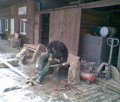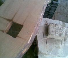 Keine Verschraubungen in den Steinen – mit Winkeln oder Dübeln – keine gerade gesägten oder abgerichteten Bohlen – alle “original mit der Waldkante“ – teilweise mit Sägespuren von der Gattersäge!
